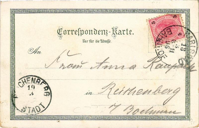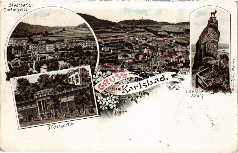 Leírás: 1896 (Vorläufer!) Karlovy Vary, Karlsbad; Stadtpark, Felsenquelle, Hirschensprung. Ottmar Zieher Art Nouveau, floral, litho (pinholes)