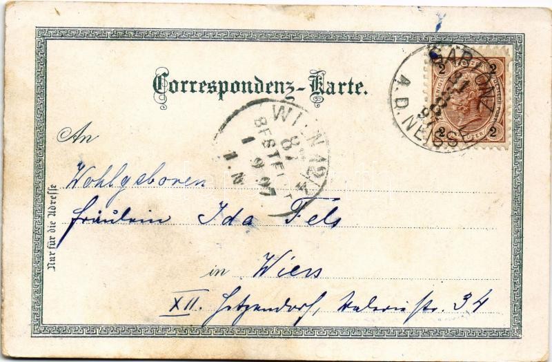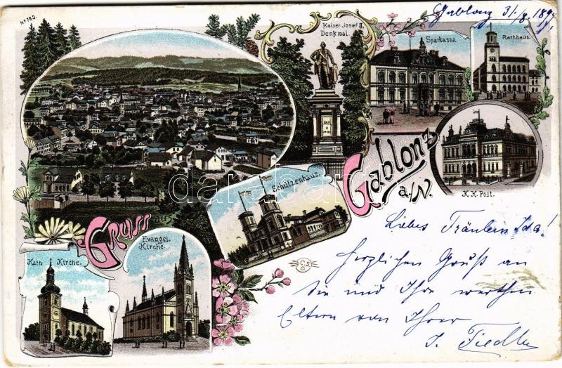 1897 (Vorläufer!) Jablonec nad Nisou, Gablonz; Kath. Kirche, Evangel. Kirche, Schützenhaus, Kaiser Josef II Denkmal, Sparkassa, Rathaus, K.K. Post / Catholic church, Lutheran church, shooting range, monument, savings bank, town hall, post office. Art Nouveau, floral, litho (EK)