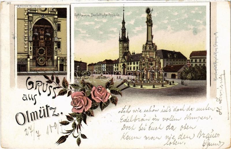 Leírás: 1897 (Vorläufer!) Olomouc, Olmütz; Astronom. Kunstuhr, Rathaus m. Dreifaltigkeitssäule. Regel & Krug Art Nouveau, floral, litho (worn corners)
