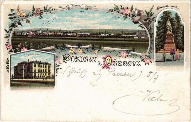 Leírás: 1897 (Vorläufer!) Prerov, C. k. gymnasium, Komenského pomník. Art Nouveau, floral, litho (cut)