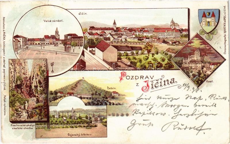 1898 (Vorläufer) Jicín, Velké námestí, Kost, Vojensky hrbitov, Prachov... https://www.darabanth.com/hu/426-Gyorsarveres/426.0/Kepeslapok/Cseh-Koztarsasag~1500068/1898-Vorlaufer-Jicin-Velke-namesti-Kost-Vojensky-hrbitov-Prachovske-skaly-Art-Nouveau-~II2688600