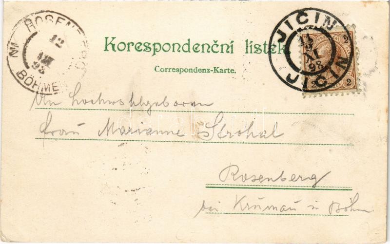 Leírás: 1898 (Vorläufer) Jicín, Velké námestí, Kost, Vojensky hrbitov, Prachovské skály. Art Nouveau, floral, litho (EK)