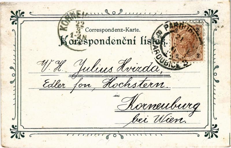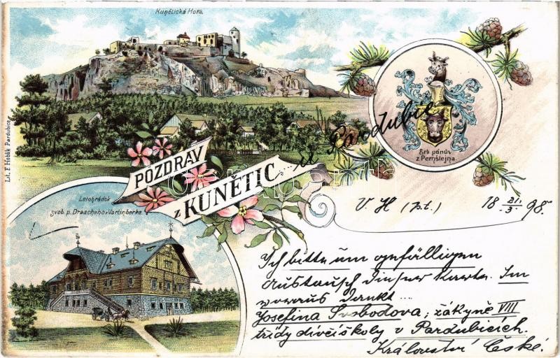 Leírás: 1898 (Vorläufer) Kunetice, Kunetická Hora, Letohrádek, Erb pánuv z Pernstejna / castle, villa, coat of arms. Lit. F. Hoblík Art Nouveau, floral, litho