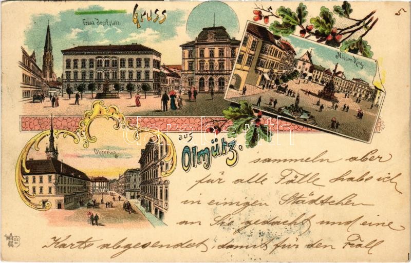 Leírás: 1898 (Vorläufer) Olomouc, Olmütz; Franz Josefplatz, Nieder-Ring, Ober-Ring. O.Z.M. Art Nouveau, floral, litho (EK)