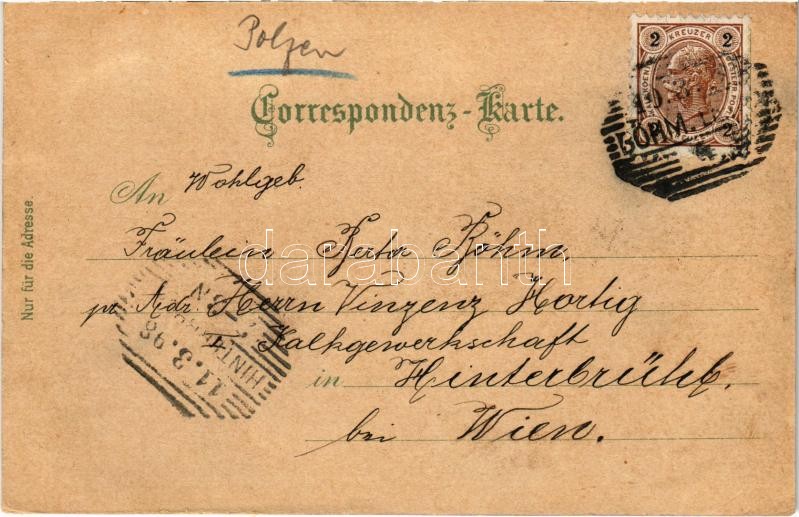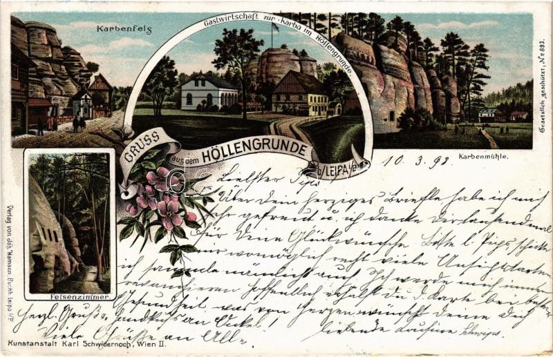 1898 (Vorläufer) Peklo, Höllengrund bei Leipa; Karbenfels, Gastwirtschaft zur Karba im Höllengrunde, Karbenmühle, Felsenzimmer. Karl Schwidernoch Art Nouveau, floral, litho (small tear)