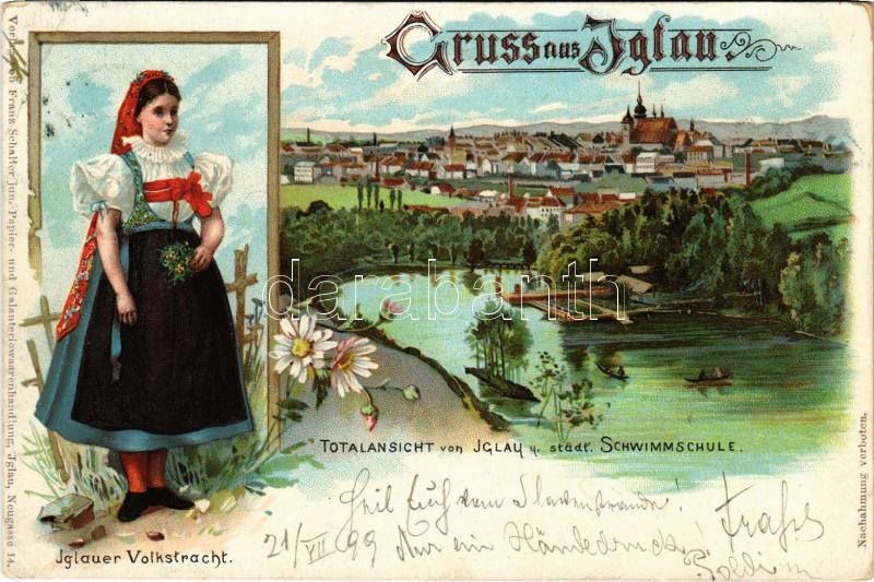 Leírás: 1899 (Vorläufer) Jihlava, Iglau; Iglauer Volkstracht, Totalansicht von Iglau u. städt. Schwimmschule / Czech folklore, traditional costume, swimming school. Art Nouveau, floral, litho (EB)