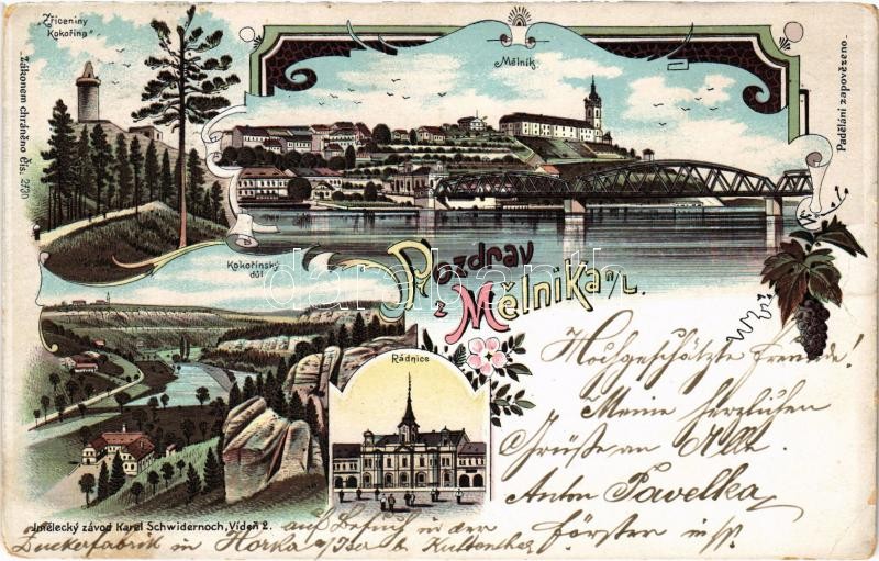 Leírás: 1899 (Vorläufer) Melník, Zriceniny Kokorina, Kokorinsky dul, Rádnice. Karl Schwidernoch Art Nouveau, floral, litho (EK)