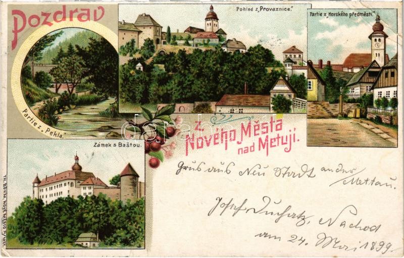1899 (Vorläufer) Nové Mesto nad Metují, Pohled z Provaznice, Horského predmestí, Zámek s Bastou, Partie z Pekla. Th. Böhm Art Nouveau, floral, litho (EB)