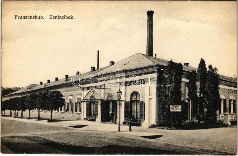 Leírás: Frantiskovy Lázne, Franzensbad; Zentralbad, Inhalatorium, Cafe Garten / spa, central bath, café