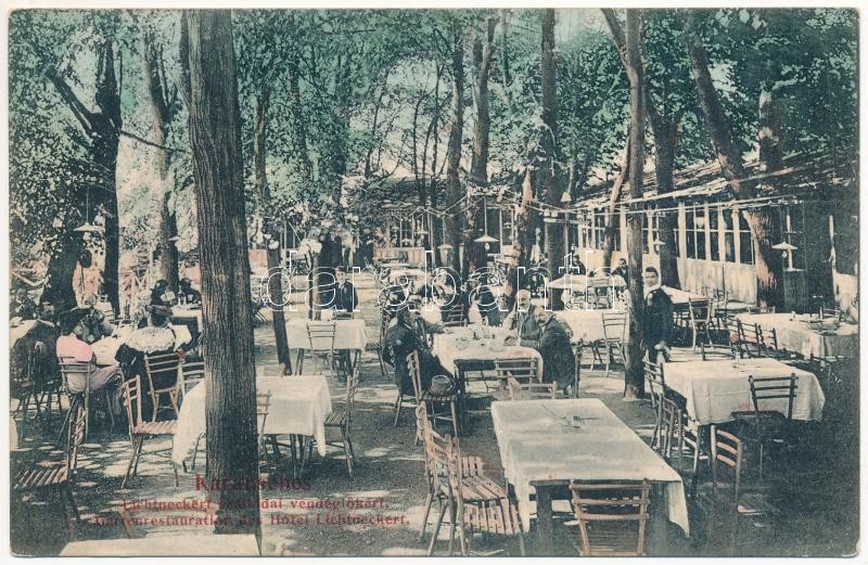 1913 Karánsebes, Caransebes; Lichtneckert szálloda vendéglőkertje, vendégek és pincérek. H. Rosenfeld kiadása / Gartenrestauration des Hotel Lichtneckert / hotel, restaurant garden with guests and waiters (EK)