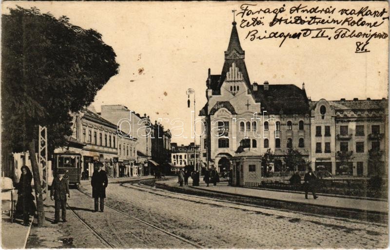 Leírás: 1915 Temesvár, Timisoara; Andrássy út, Városi bérpalota, villamos / street view, palace, tram (r)