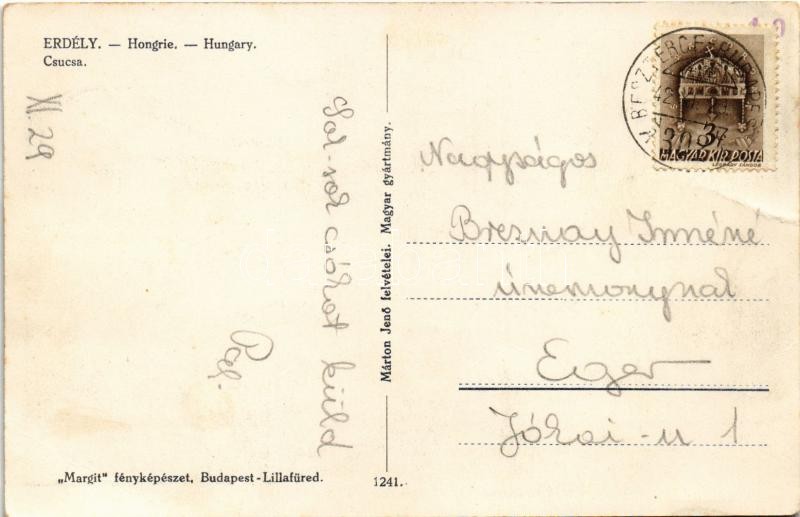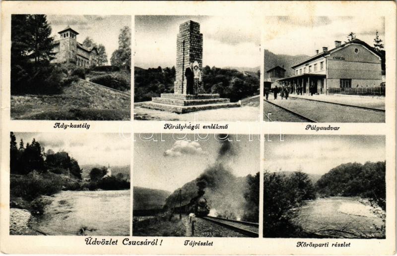 1942 Csucsa, Ciucea; Ady kastély, Királyhágói emlékmű, Pályaudvar, vasútállomás, Táj részlet, gőzmozdony, vonat, Körös-parti részlet / castle, monument, railway station, locomotive, train, Cris riverside + "BESZTERCE - BUDAPEST 302 A" vasúti mozgóposta bélyegző (fl)