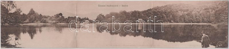 Leírás: Felsőbánya, Baia Sprie; Bódi tó. Három részes kinyitható panorámalap, Vagányi felvétele és kiadása / lake. 3-tiled folding panoramacard