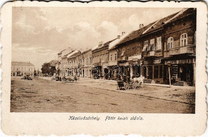 Kézdivásárhely, Targu Secuiesc; Fő tér keleti oldala, Mánya Dávid, Császár Gergely, Pánczél Károly és Bartha Gyula üzlete, piac / main square, shops, market