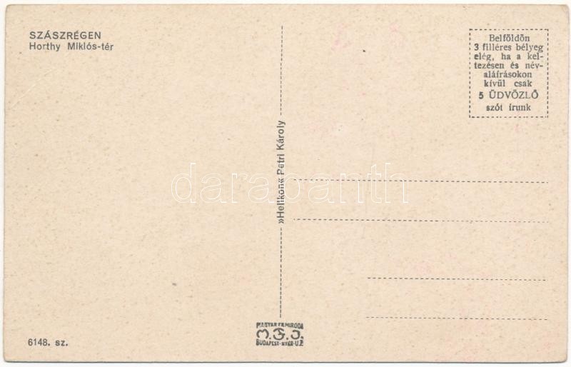 Szászrégen, Reghin; Horthy Miklós tér / square (EB) https://www.darabanth.com/hu/426-Gyorsarveres/426.0/Kepeslapok/Erdely~1500006/Szaszregen-Reghin-Horthy-Miklos-ter-square-EB~II2719889