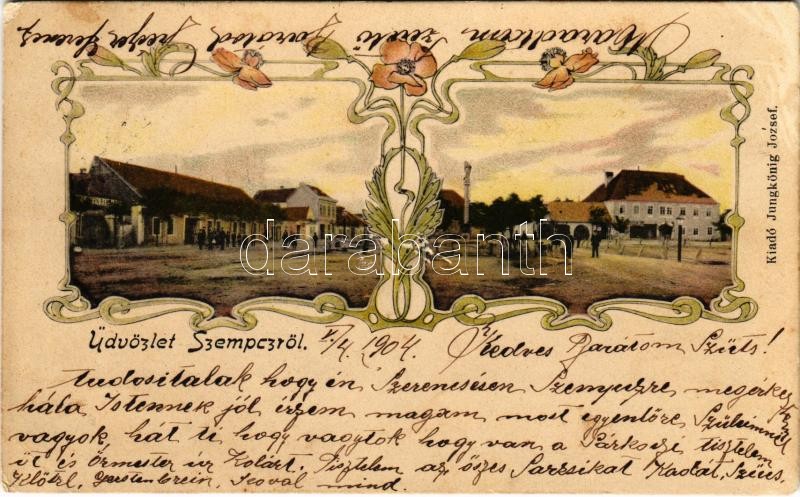 Leírás: 1904 Szenc, Szencz, Szempcz, Senec; Fő utca, tér, üzletek. Jungkönig József kiadása / street view, square, shops. Art Nouveau, floral (lyuk / pinhole)