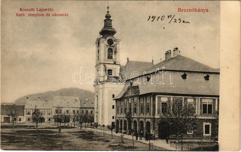 1910 Breznóbánya, Brezno nad Hronom; Kossuth Lajos tér, Római katolikus templom és városháza. Kreisler József kiadása / square, Catholic church, town hall