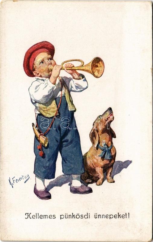 Leírás: Kellemes pünkösdi ünnepeket! / Children art postcard, Pentecost greeting with Dachshund dog. B.K.W.I. 974-5. s: K. Feiertag (EK)