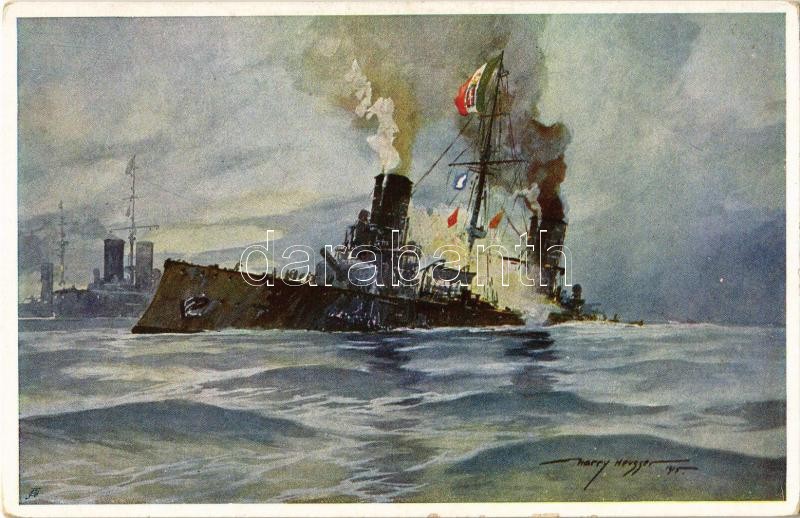 Leírás: Torpedierung des ital. Panzerkreuzers Giuseppe Garibaldi. K.u.K. Kriegsmarine / WWI Austro-Hungarian Navy, Italian Armored cruiser. Offizielle Karte für Rotes Kreuz, Kriegsfürsorgeamt, Kriegshilfsbureau. Österreichischen Flottenverein s: Harry Heusser