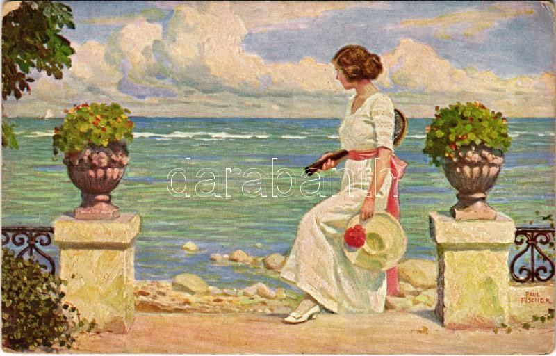 Leírás: Isn't he coming? - Lady with tennis racket. Alex. Vincents Maleriserie Nr. 46. s: Paul Fischer (EK)
