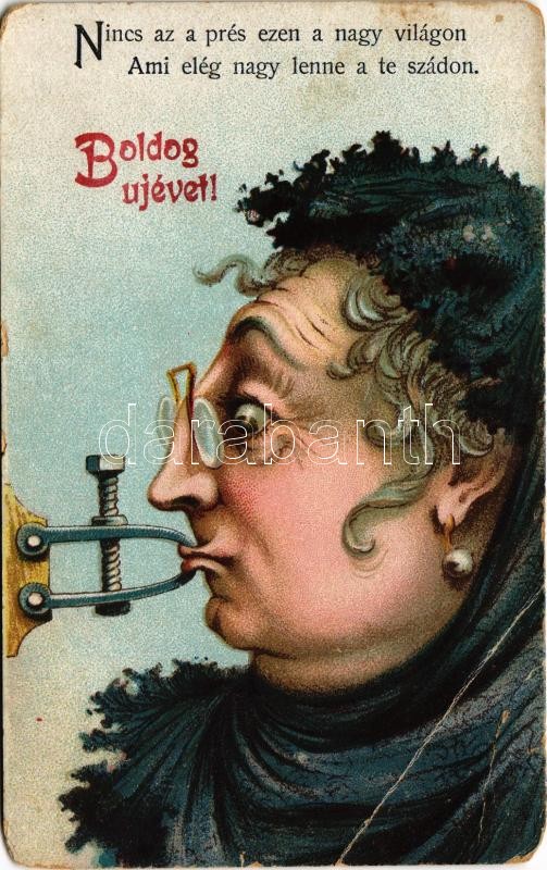 Leírás: Nincs az a prés ezen a nagy világon, ami elég nagy lenne a te szádon. Boldog Újévet! / angry wife humour with New Year greeting, sealed mouth (EM)
