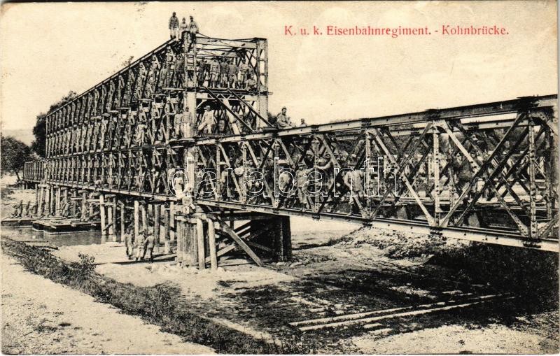 K.u.K. Eisenbahnregiment. Kohnbrücke. Verlag J. L. K. No. 80. / Austro-Hungarian railway regiment, military railway bridge construction, truss bridge with soldiers (EK)