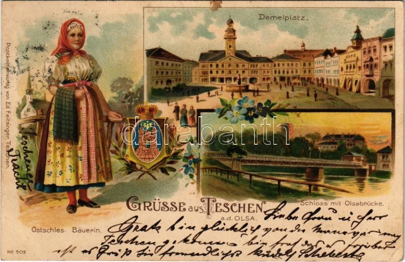 Leírás: 1903 Cieszyn, Teschen; Demelplatz, Schloss mit Olsabrücke, Ostschles. Bäuerin / square, castle, bridge, Upper Silesian folklore, coat of arms. Postkartenverlag Ed. Feitzinger No. 502. Art Nouveau, floral, litho (fl)