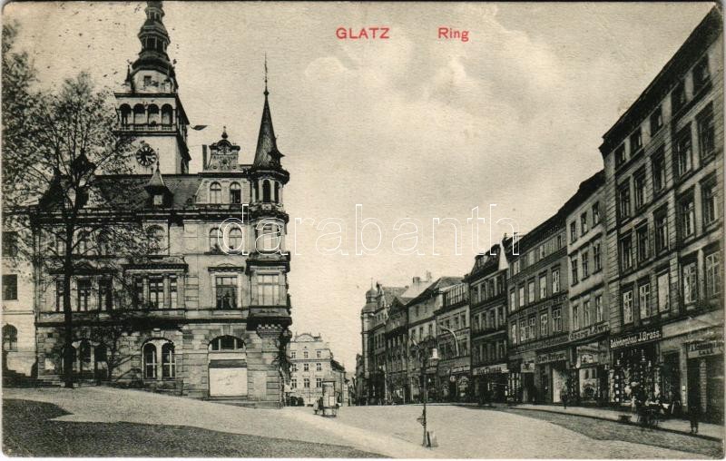 1916 Klodzko, Glatz; Ring, Hotel zum schwarzen Bär / square, town hall, shops of J. Brass, Georg Löwy, Carl Rittner, Max Thomas. Verlag J. Radzieowski (tear)