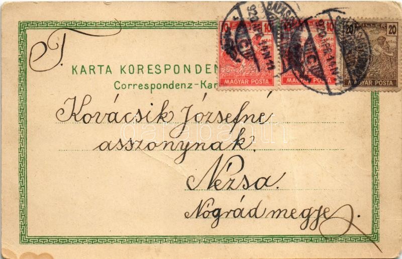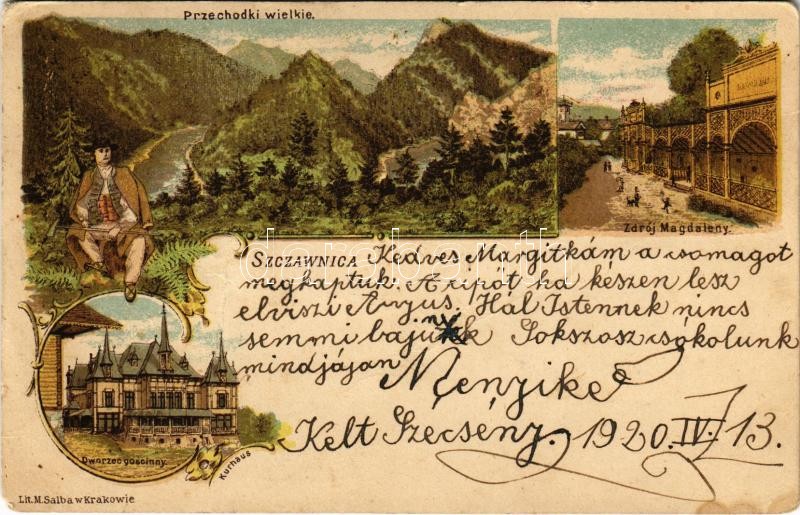 Leírás: 1920 Szczawnica, Przechodki wielkie, Dworzec goscinny, Zdrój Magdaleny / mountains, spa, bath, hotel, folklore. Lit. M. Salba Art Nouveau, litho (fa)