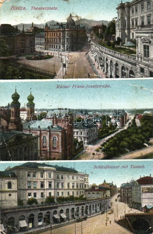 Leírás: Bielsko-Biala, Bielitz; Theaterplatz, Kaiser Franz Josefstrasse, Schlossbazar, Tunnel / theatre square, street, castle bazaar, tunnel (fa)