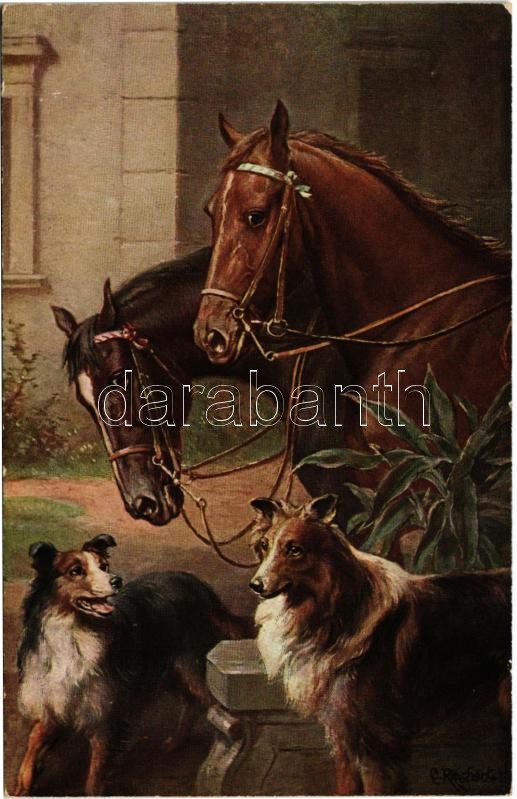 Horses with dogs. T.S.N. Serie 1543. s: Reichert https://www.darabanth.com/hu/426-Gyorsarveres/426.0/Kepeslapok/Lo~1500037/Horses-with-dogs-TSN-Serie-1543-s-Reichert~II2713809