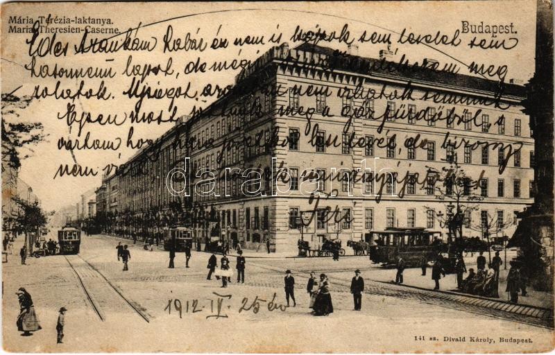 Leírás: 1912 Budapest VIII. Mária Terézia laktanya, villamos a körúton és az Üllői úton is. Divald Károly 141. sz. (fl)