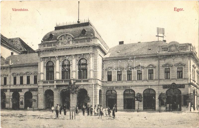 Leírás: 1915 Eger, Városháza, Lázár Jónás és Társai, Braun Adolf üzlete, Gyógyszertár. Károly Gyula kiadása