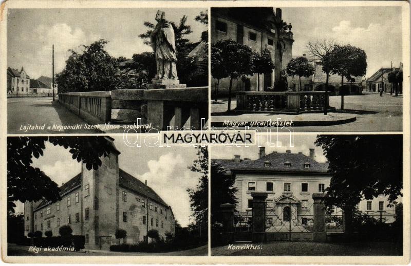 1933 Magyaróvár, Mosonmagyaróvár; Lajta híd a Nepomuki Szent János szoborral, Magyar utcai részlet, Régi akadémia, Konviktus (kopott sarok / worn corner)