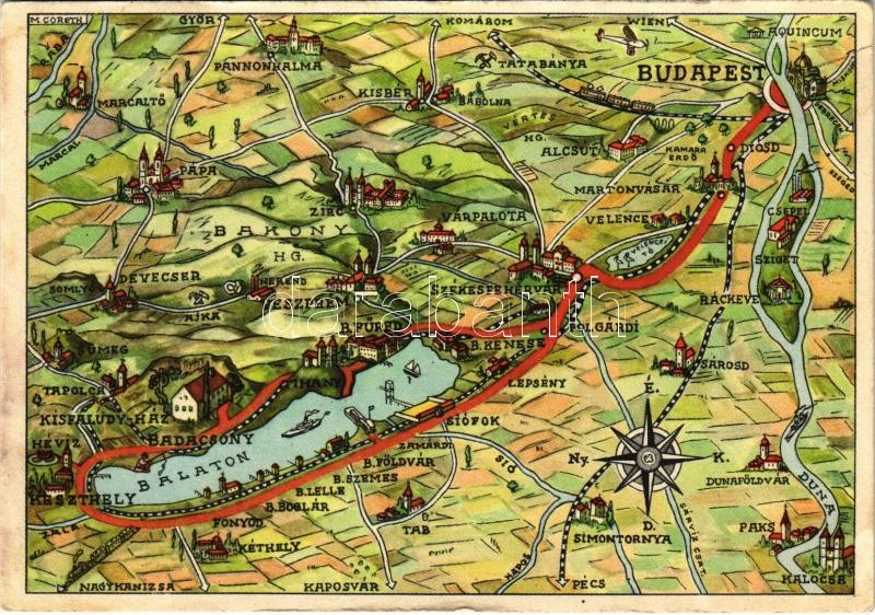 Balaton. Térkép útvonallal Budapestről (Klösz) s: M. Coreth (EK) https://www.darabanth.com/hu/426-Gyorsarveres/426.0/Kepeslapok/Magyarorszag~1500005/Balaton-Terkep-utvonallal-Budapestrol-Klosz-s-M-Coreth-EK~II2722657