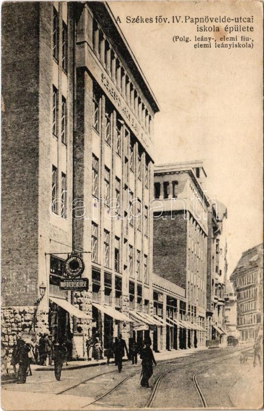 Budapest V. Székesfővárosi Papnövelde utcai iskola épülete (polgári leány, elemi fiú és elemi leány iskola), M. Kir. dohánytőzsde nyilvános telefonnal, Balla Aladár papírkereskedése (EK)