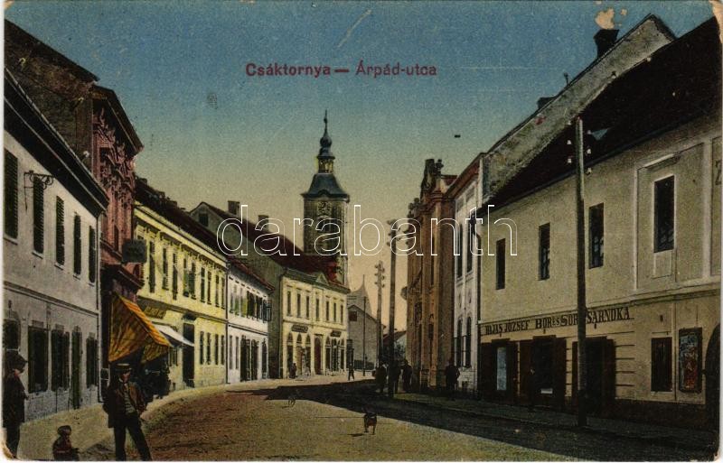 1918 Csáktornya, Cakovec; Árpád utca, Hajas József bor és sörcsarnoka, Kelemen Béla üzlete. Fischel Fülöp (Strausz Sándor) kiadása / street view, inn, beer hall, shops (EK)
