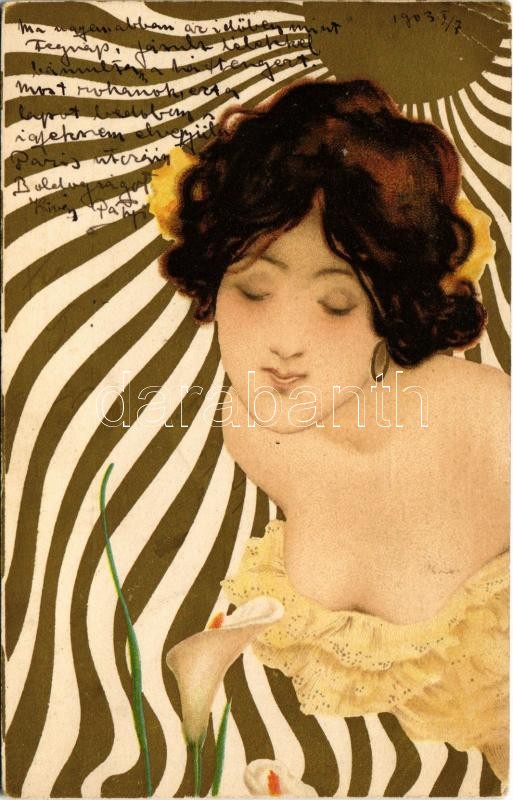 1903 Art Nouveau lady. litho. Unsigned Raphael Kirchner (EK) https://www.darabanth.com/hu/426-Gyorsarveres/426.0/Kepeslapok/Muveszlapok~1500039/1903-Art-Nouveau-lady-litho-Unsigned-Raphael-Kirchner-EK~II2720944