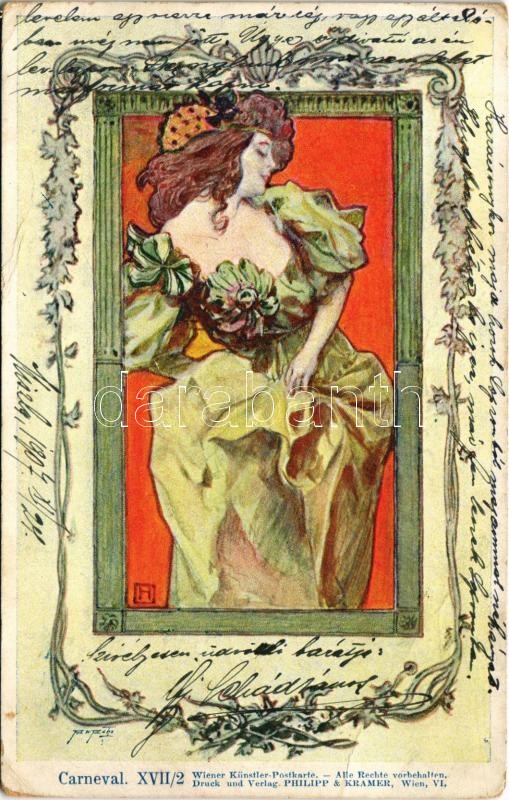 1907 Carneval XVII/2. Art Nouveau lady art postcard. Wiener Künstler-P... https://www.darabanth.com/hu/426-Gyorsarveres/426.0/Kepeslapok/Muveszlapok~1500039/1907-Carneval-XVII2-Art-Nouveau-lady-art-postcard-Wiener-Kunstler-Postkarte-Druck-und-Verlag-Ph~II2719204