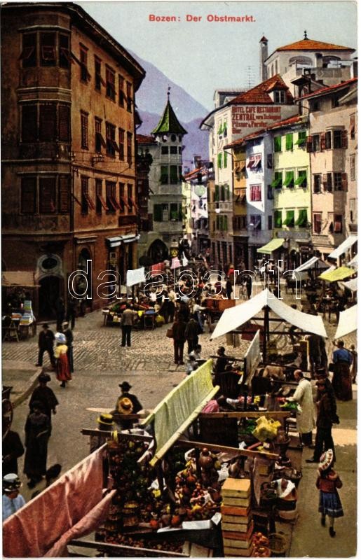 1911 Bolzano, Bozen (Südtirol); Der Obstmarkt / fruit market, Hotel Ca... https://www.darabanth.com/hu/426-Gyorsarveres/426.0/Kepeslapok/Olaszorszag~1500093/1911-Bolzano-Bozen-Sudtirol-Der-Obstmarkt-fruit-market-Hotel-Cafe-Restaurant-Zentral~II2714989
