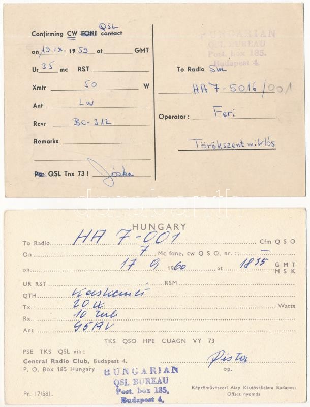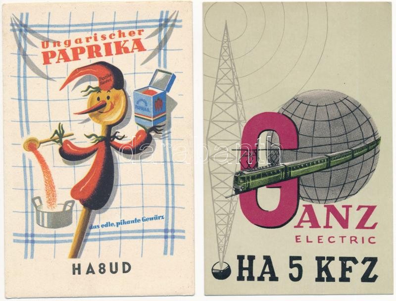 2 db modern magyar QSL, azaz rádióamatőr összeköttetést igazoló lap: Ungarischer Paprika, Ganz Electric reklám / 2 MODERN Hungarian QSL, i.e. confirmation cards of a two-way communication between two amateur radio stations, advertisements