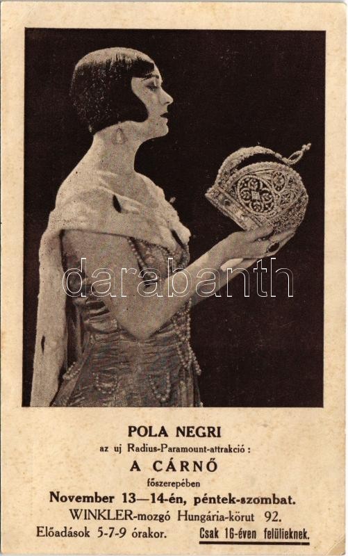 Leírás: Pola Negri az új Radius-Paramount-attrakció: A Cárnő főszerepében. Winkler Mozgó Budapesten a Hungária körút 92. szám alatt (EK)