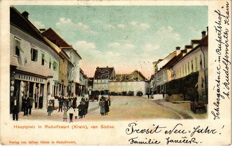 Leírás: 1904 Rudolfovo, Rudolfswert; Hauptplatz von Süden. Verlag v. Alfons Oblak / main square, publisher's shop (EK)