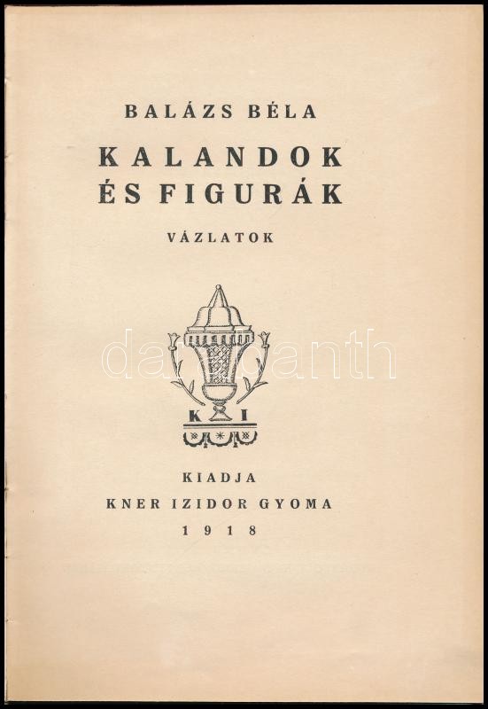 Balázs Béla: Kalandok és figurák. Vázlatok. Gyoma, 1918., Kner Izidor, 1 (címkép, Balázs Béla arcképe)+203 p. Első kiadás. A címlap Kozma Lajos munkája. Korabeli avantgárd egészvászon-kötés, (Kner Erzsébet-kötés?), festett lapélekkel, a borítón kopásnyomokkal.