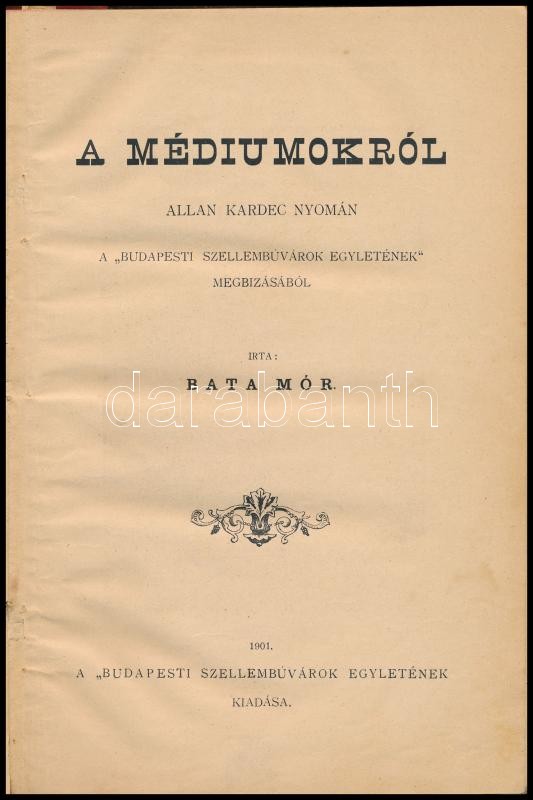 Bata Mór: A Médiumokról. Allan Kardec nyomán a "Budapesti Szellembúvárok Egyletének" megbízásából. Bp., 1901., Budapesti Szellembúvárok Egylete", 219 p. Átkötött félvászon-kötés, kopott borítóval, javított kötéssel, egy-két foltos lappal, pár lapon bejelöléssel.