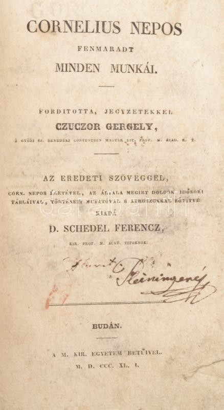 Cornelius Nepos fennmaradt minden munkái. Fordította, jegyzetekkel Czuczor Gergely. Buda, 1841, M. Kir. Egyetemi ny. Térkép melléklettel. Kartonált kötés, firkákkal, kopottas állapotban.