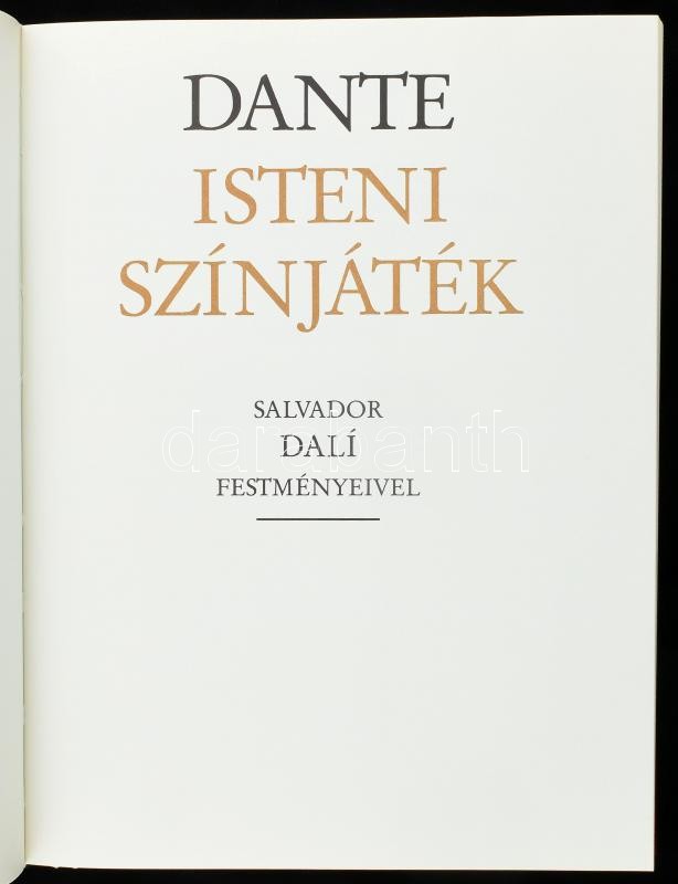Dante Alighieri: Isteni színjáték. Ford.: Babits Mihály. Salvador Dalí illusztrációival. Bp., 1987, Helikon, 317+(3) p. Kiadói bársonykötés, papír védőborítóban, kiadói papírtokban, néhány lapon gyűrődésekkel, egyébként jó állapotban.