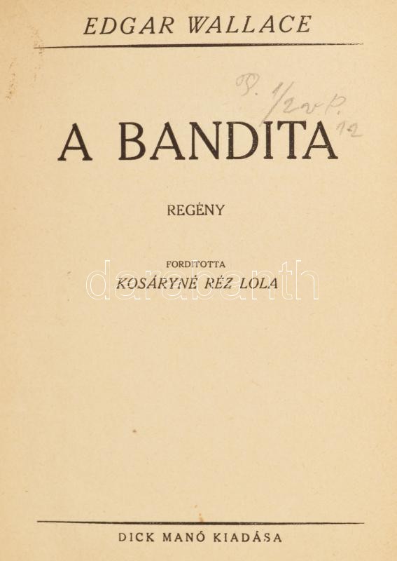 Leírás: Edgar Wallace két regénye: A bandita, Borzalmak kastélya. Egybe kötve. Bp., é.n. Dick Manó. Korabeli félvászon kötésben