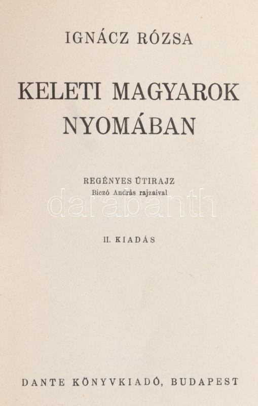 Ignácz Rózsa: Keleti magyarok nyomában. Regényes útirajz. Biczó András rajzaival. Bp., 1941, Dante, 1 t. + 198+(1) p. Második kiadás. Kiadói félvászon-kötés, kissé kopott, sérült gerinccel, kijáró elülső szennylappal. Számozott (1874.) példány, a szerző fényképével és saját kezű aláírásával.