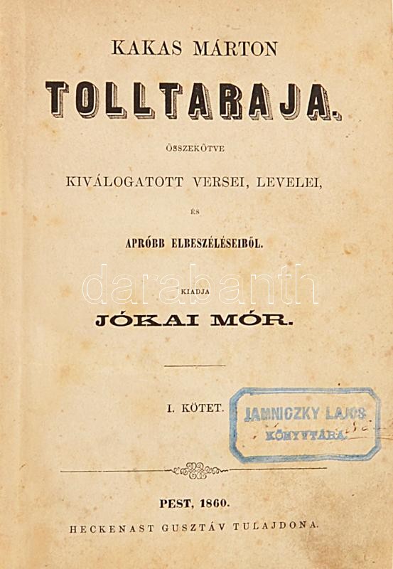 Jókai Mór: Kakas Márton tolltaraja. Összekötve kiválogatott versei, levelei, és apróbb elbeszéléseiből. I-II. köt. Pest, 1860., Heckenast Gusztáv, VI+2+160; VI+2+160 p. Első kiadás. Átkötött félvászon-kötés, márványozott lapélekkel, foltos lapokkal, egy lapon lapszéli kis sérüléssel, a II. rész címlapján possessori bejegyzéssel, egy lapon ceruzás firkával, az utolsó lapon bejegyzésekkel. Jamniczky Lajos (?-1895). műépítész, könyvgyűjtő névbélyegzőivel.